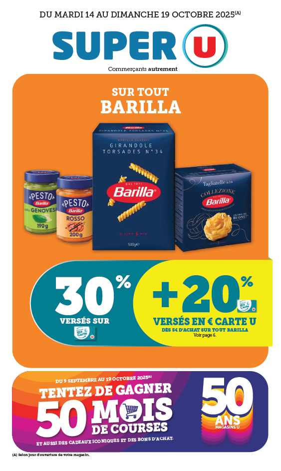 Sur présentation de la Carte U en magasin ou sur coursesu.com du 09 septembre au 19 octobre 2025 (jour de retrait ou de livraison), bénéficiez de 10 % en euros Carte U supplémentaires pour l'achat des produits U présents dans la liste "Ma Sélection Carte U" lors du premier passage en caisse éligible après l'activation de l'offre. L'offre est limitée à 7 utilisations maximum par semaine et par compte Carte U et doit être activée avant chaque passage en caisse. Liste des produits éligibles signalés en magasin et disponible à l'accueil et sur magasins-u.com. Offre valable en France métropolitaine (hors DROM-COM et Utile). Le montant cagnotté sera visible dans un délai de 1 à 3 jours sur votre espace fidélité.